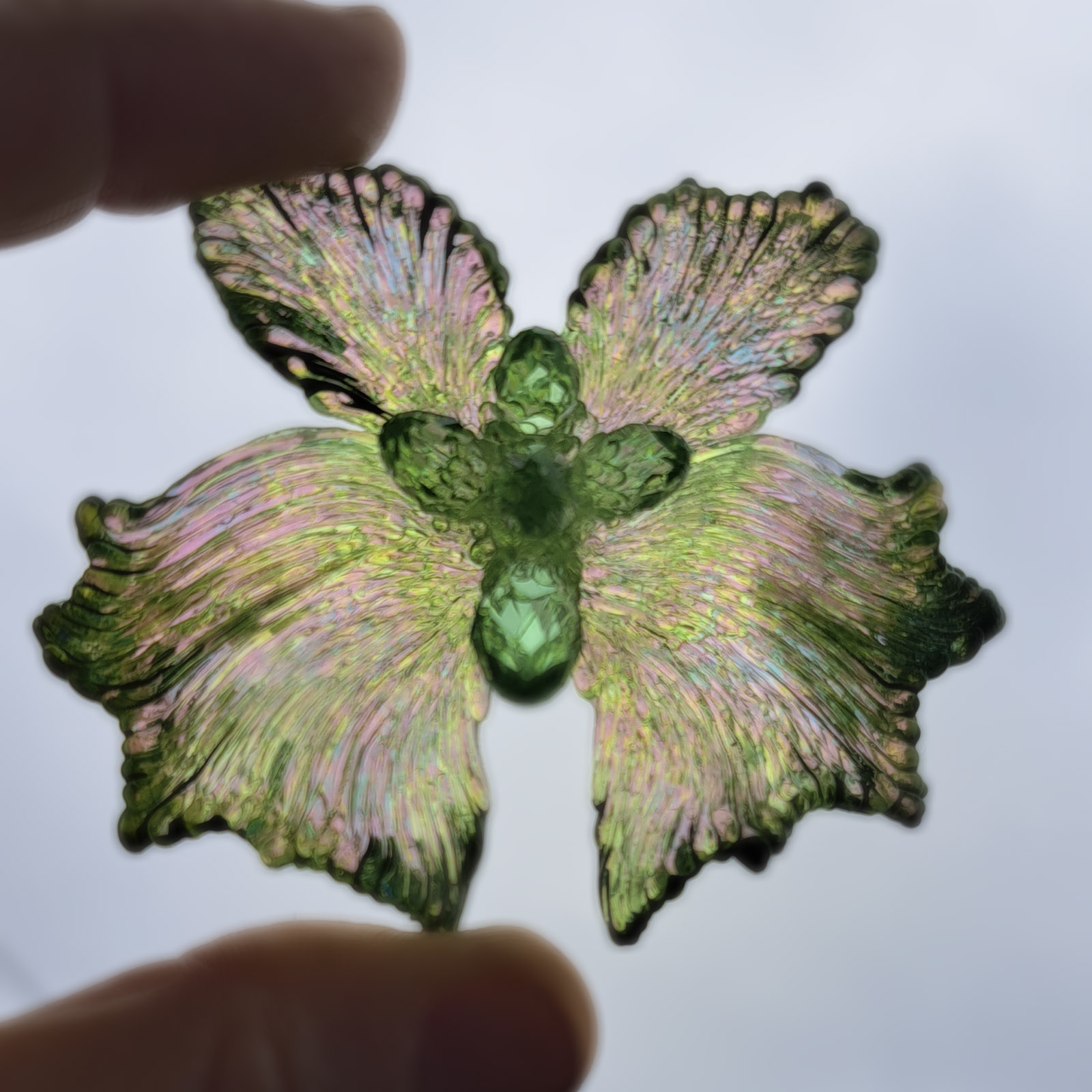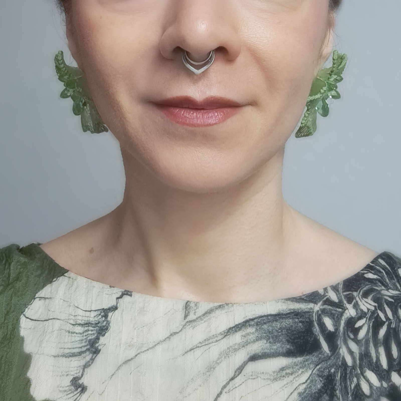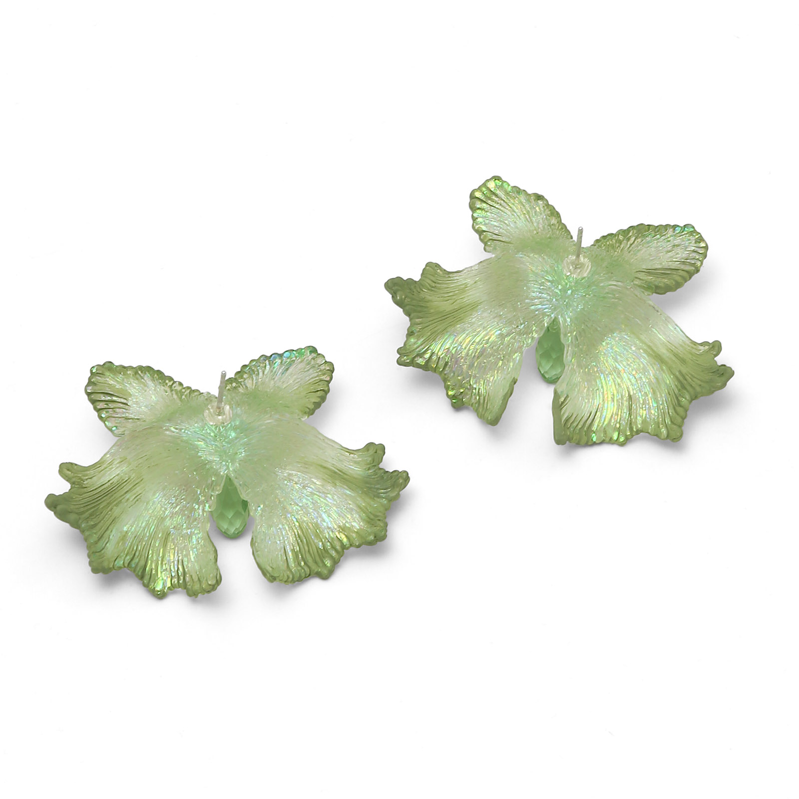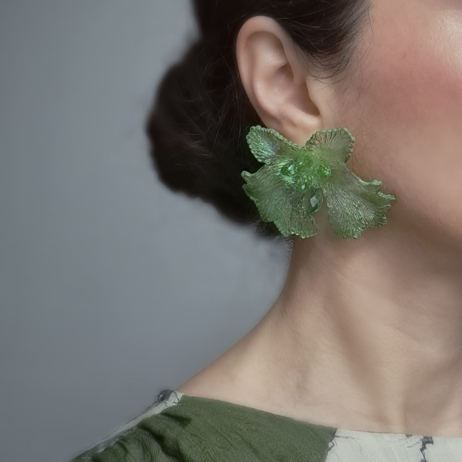 The “Aurora Borealis- Meadow Glow” earrings are illuminated by an iridescent shimmer that unfolds in delicate spectral hues. Their surface seems to hold light within, shifting gently with every movement and revealing an otherworldly glow.