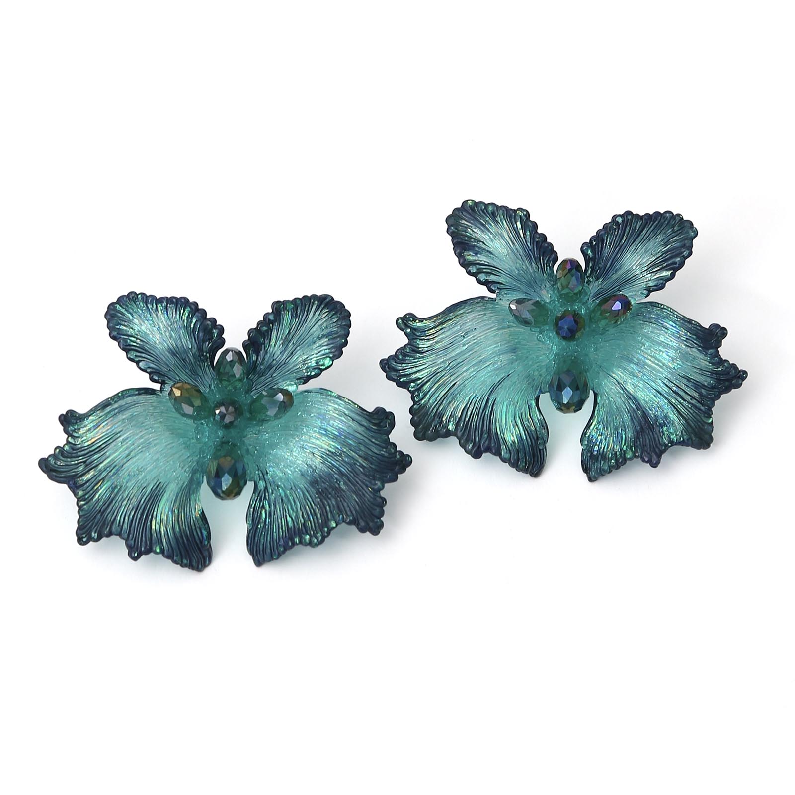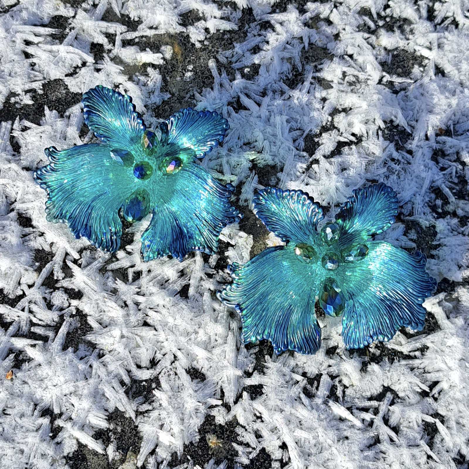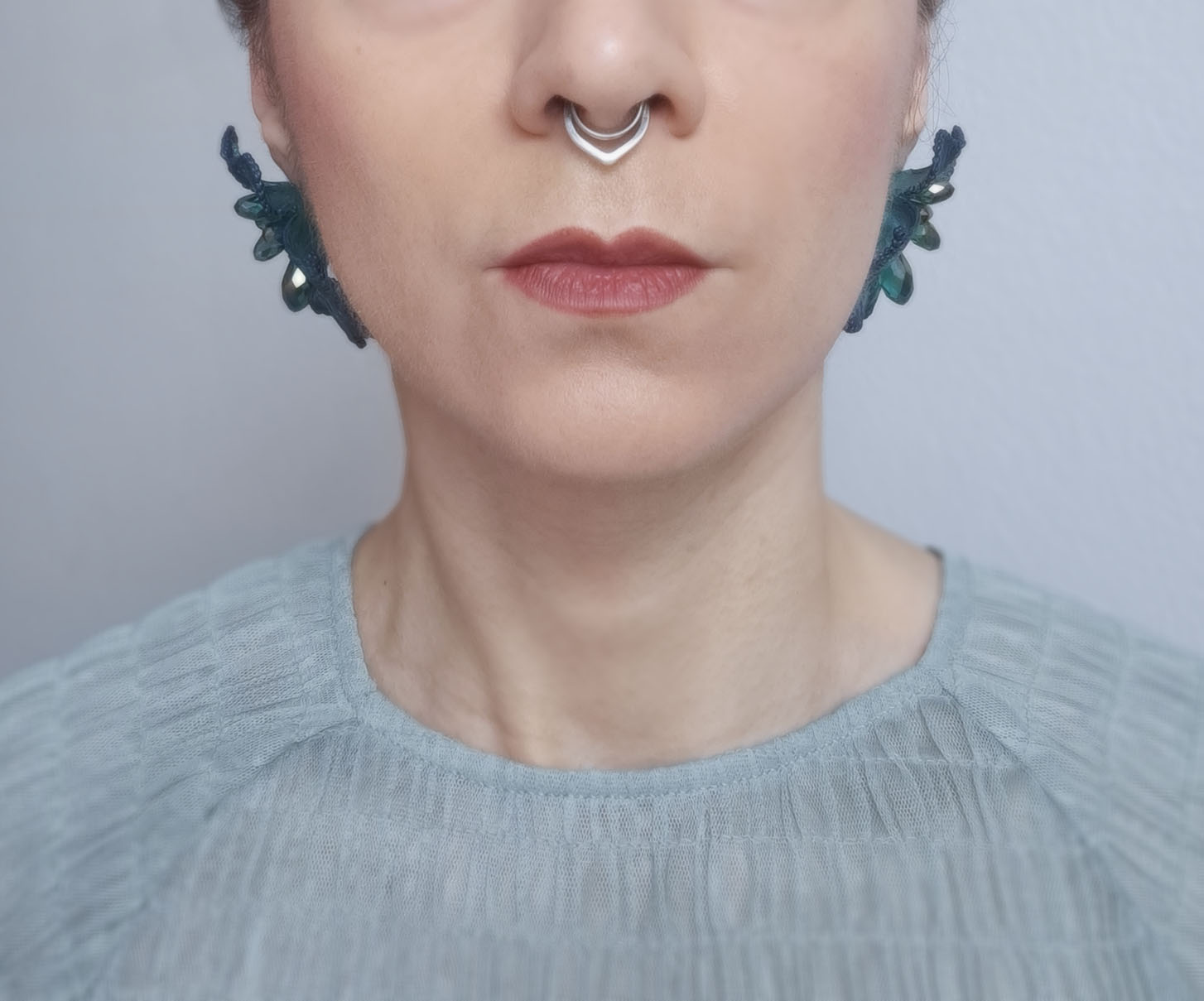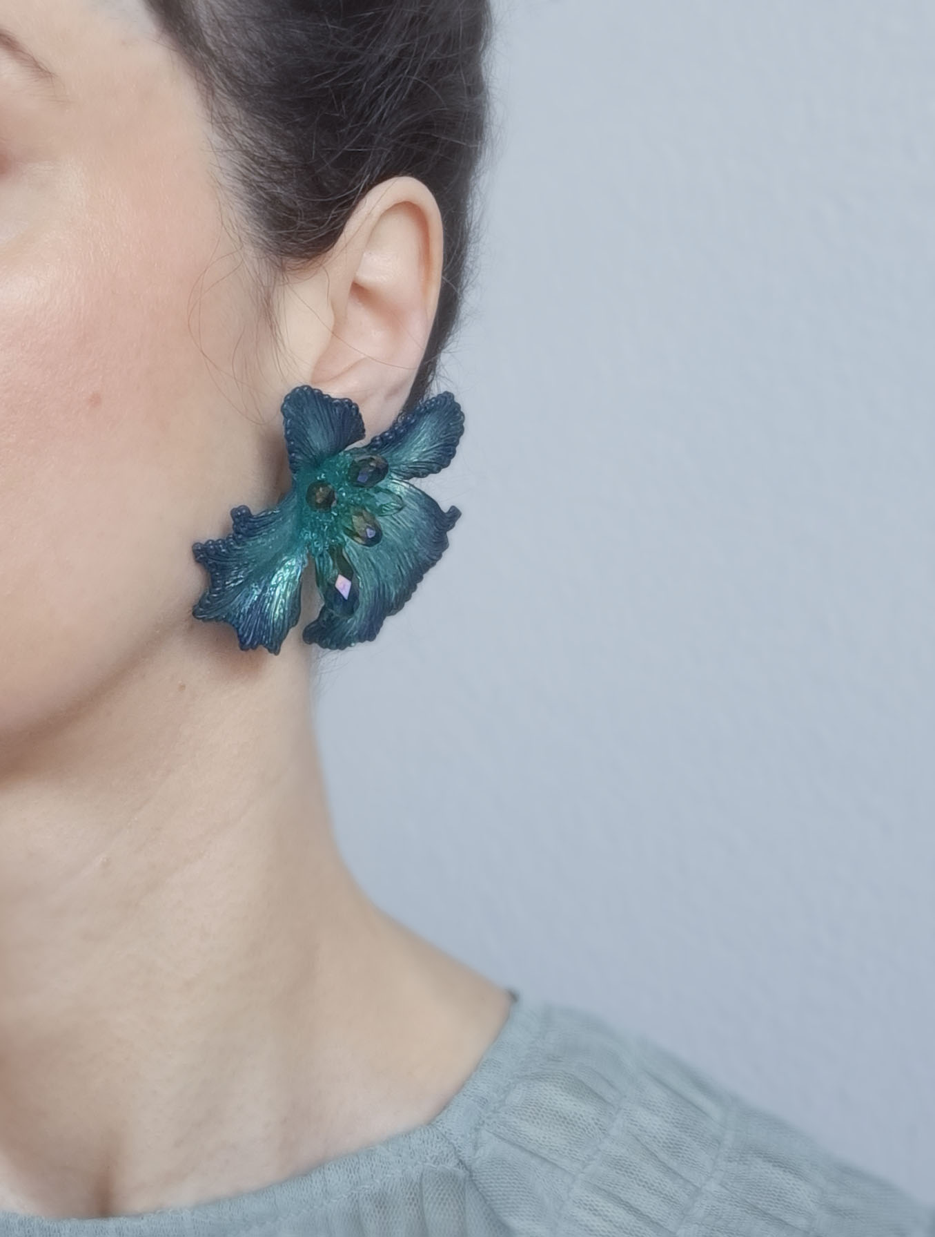 The “Aurora Borealis- Opaline Lagoon” earrings are illuminated by an iridescent shimmer that unfolds in delicate spectral hues. Their surface seems to hold light within, shifting gently with every movement and revealing an otherworldly glow.